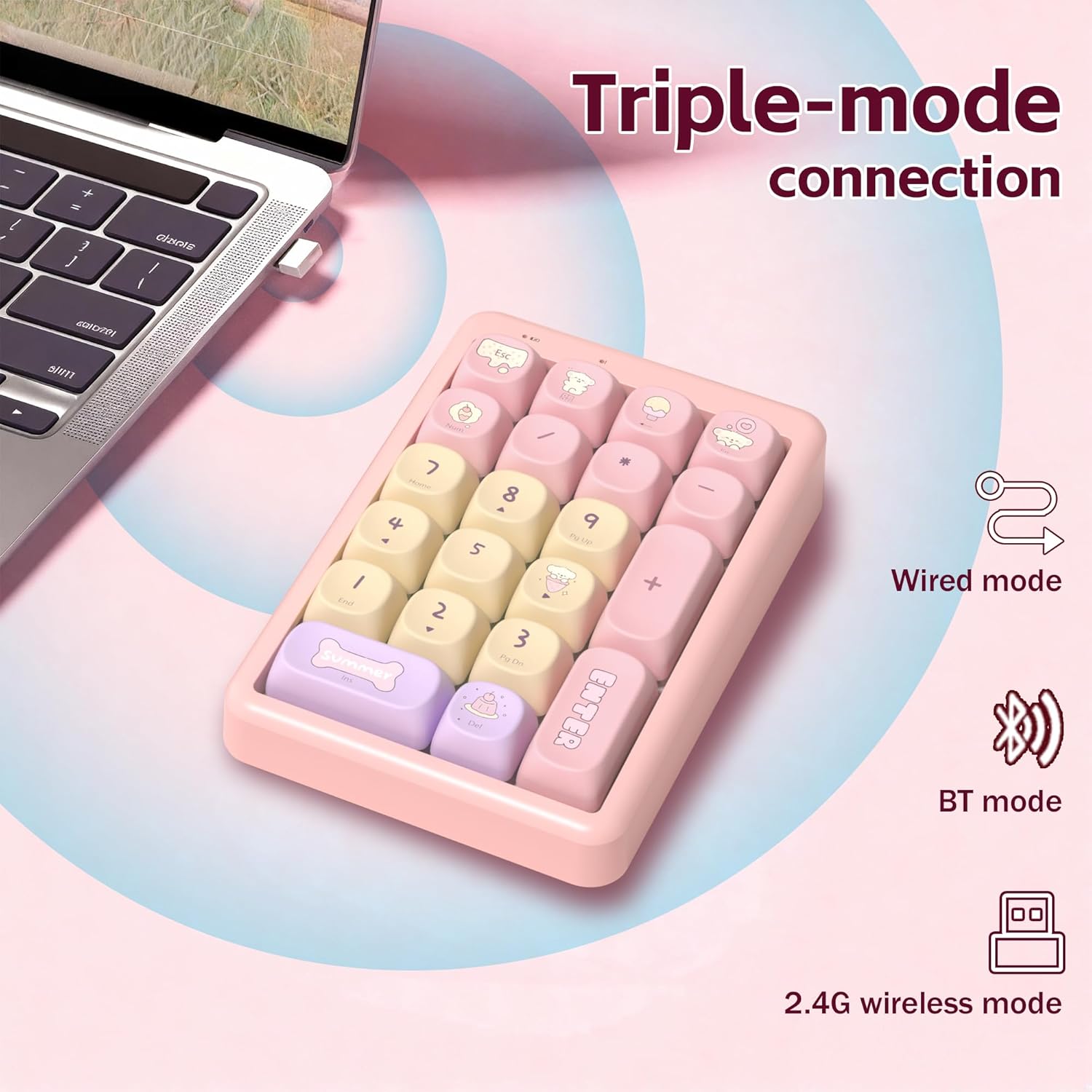 This 21-key tri-mode wireless numeric keypad features a compact layout paired with a soft, stylish pink finish. With Bluetooth 5.0, 2.4GHz wireless, and USB-C wired connectivity, it switches easily between multiple devices, making it suitable for office tasks, studying, creative work, and gaming utilities.