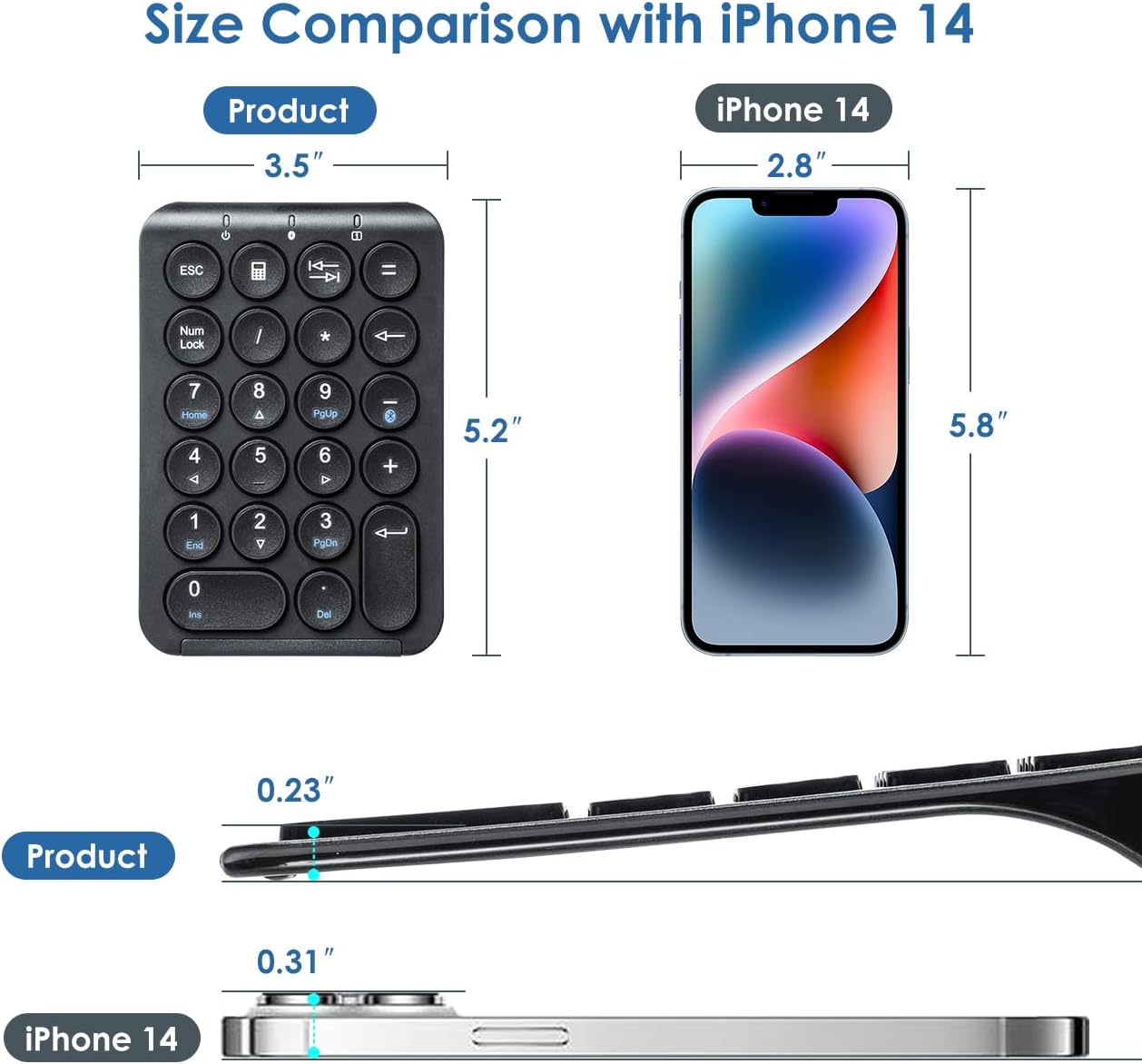 This 22-key Bluetooth wireless numeric keypad offers a compact and efficient layout designed for office work, accounting tasks, spreadsheets, studying, and everyday data entry. The full numeric section and function keys help improve productivity and simplify routine tasks.