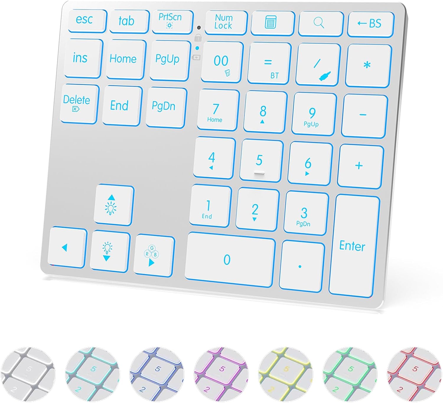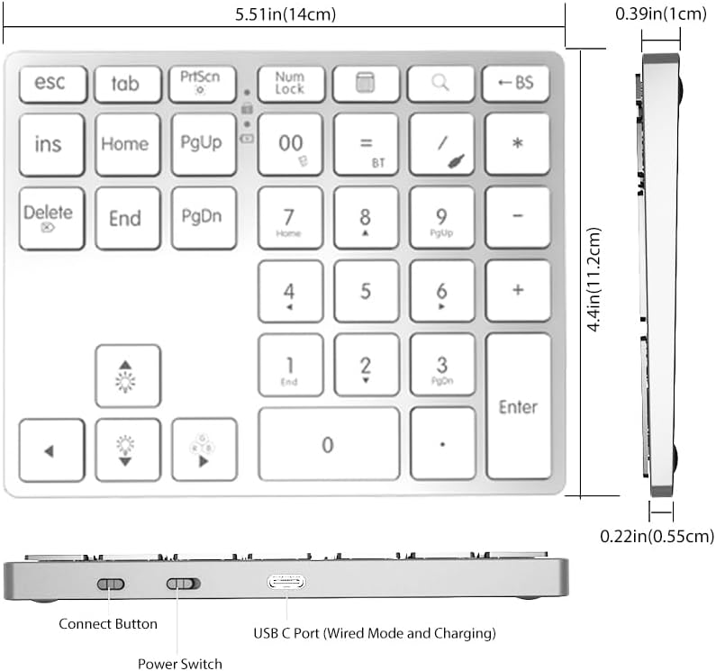 Tri-Mode Wireless Aluminum Number Pad | Bluetooth 5.0 / 2.4G / USB-C | 7-Color Backlit | Slim Low-Profile Rechargeable Numeric Keypad